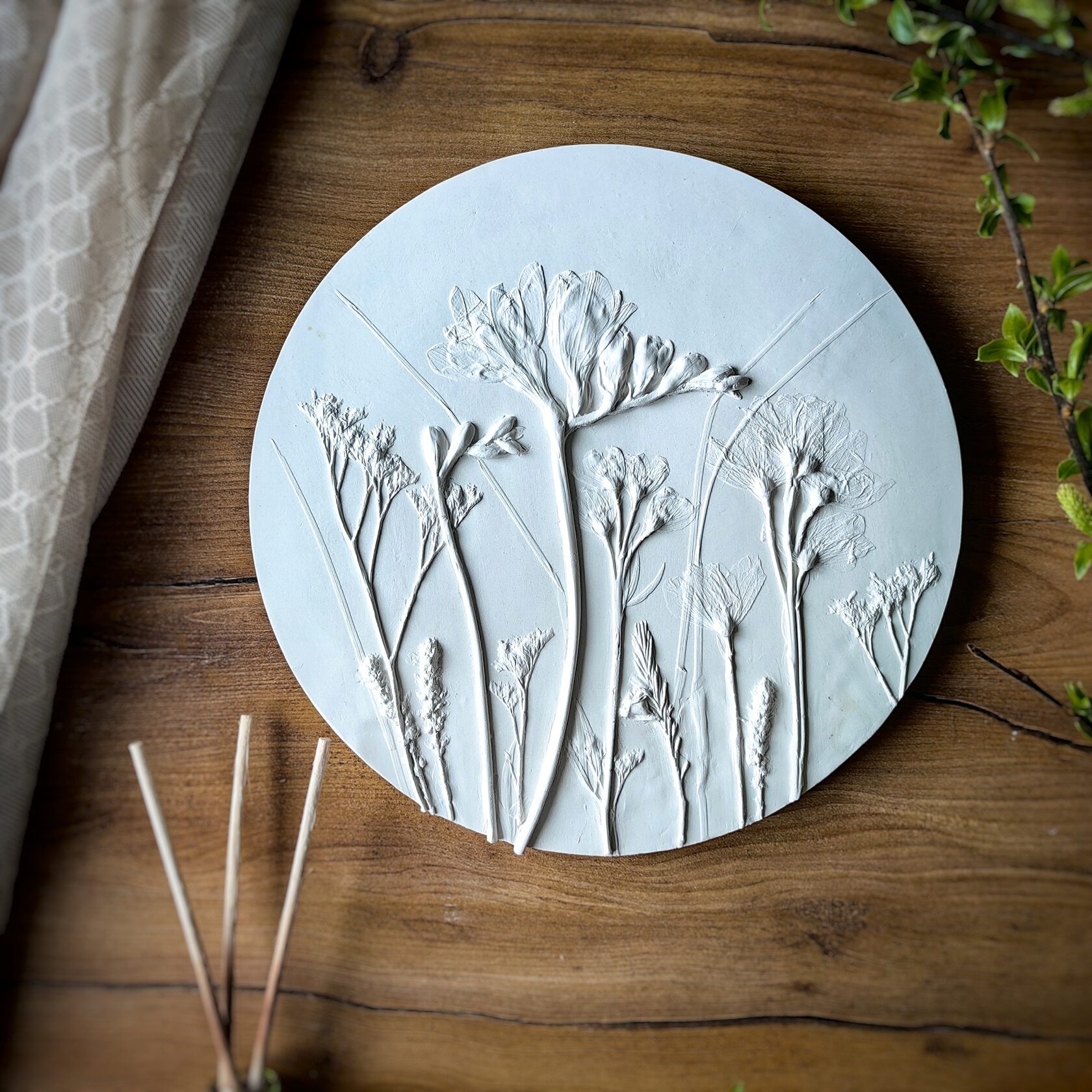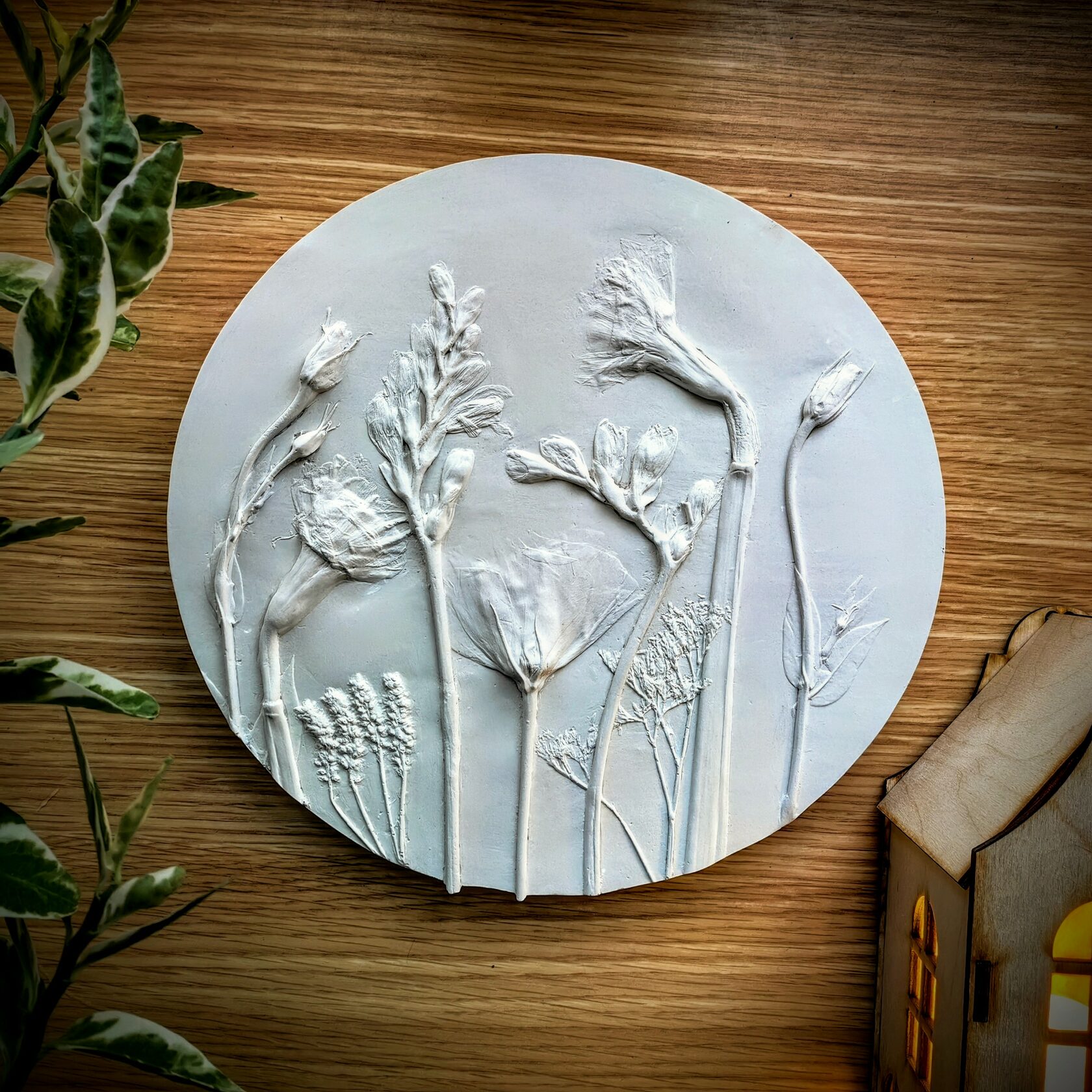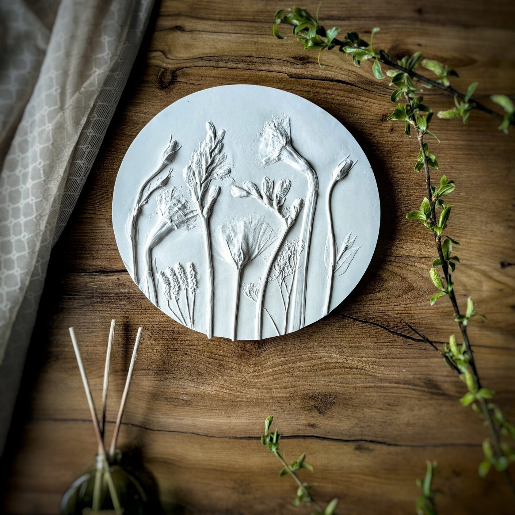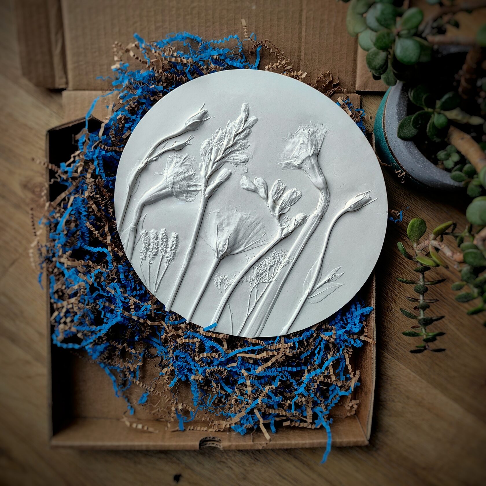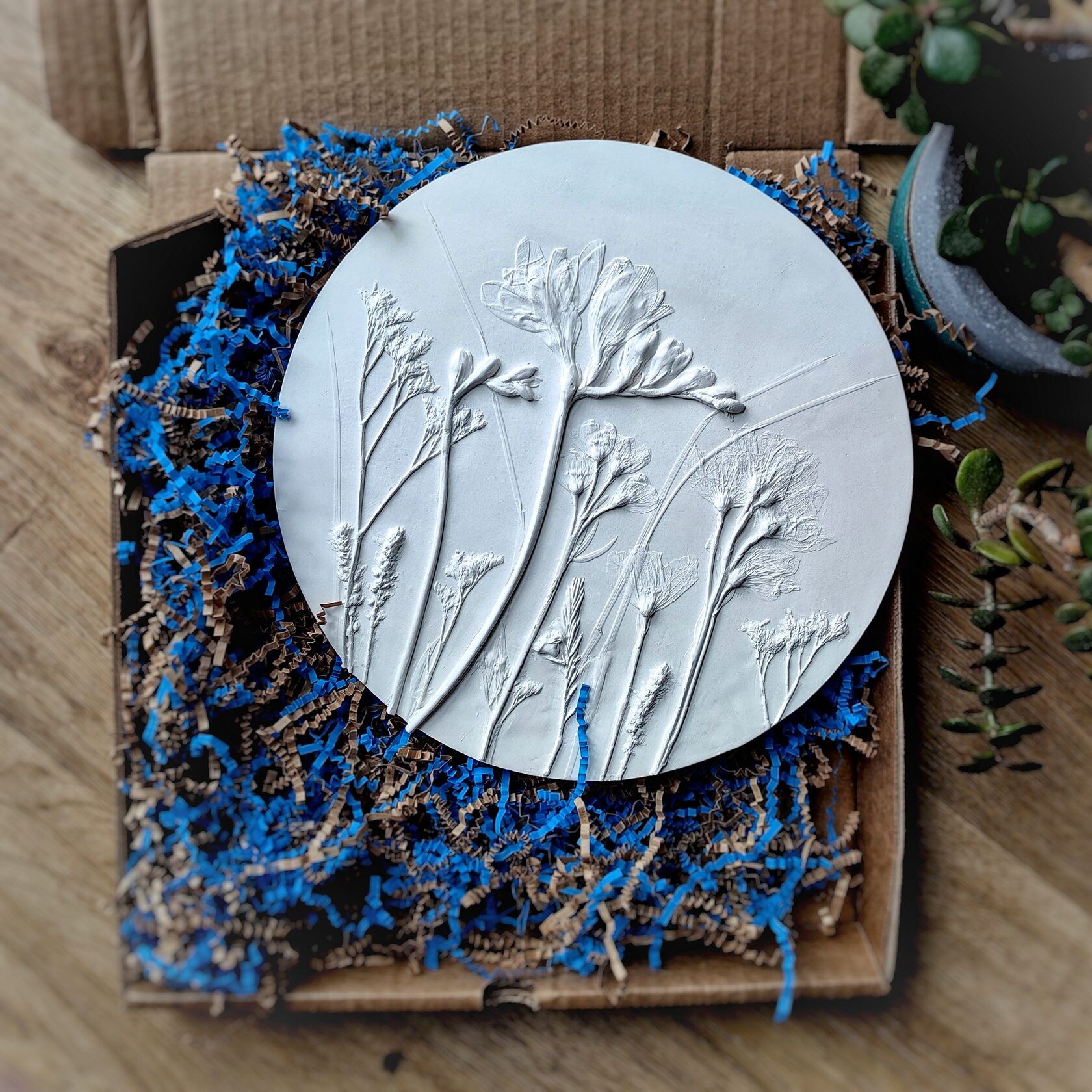 В работе мы используем живые цветы, натуральную цветную глину и высокопрочный гипс. Каждое изделие изготовлено с большой любовью к процессу и уважением к будущему обладателю панно.