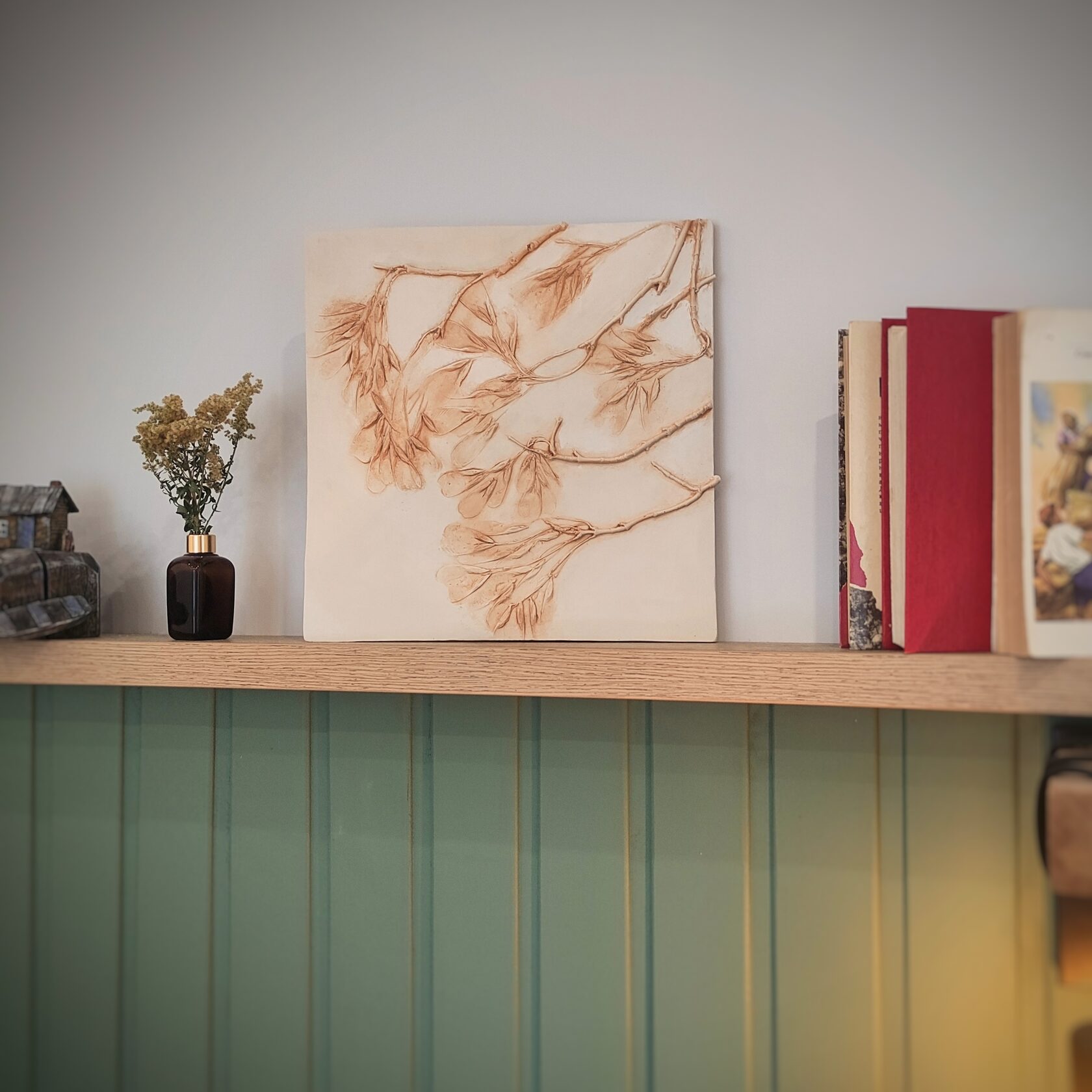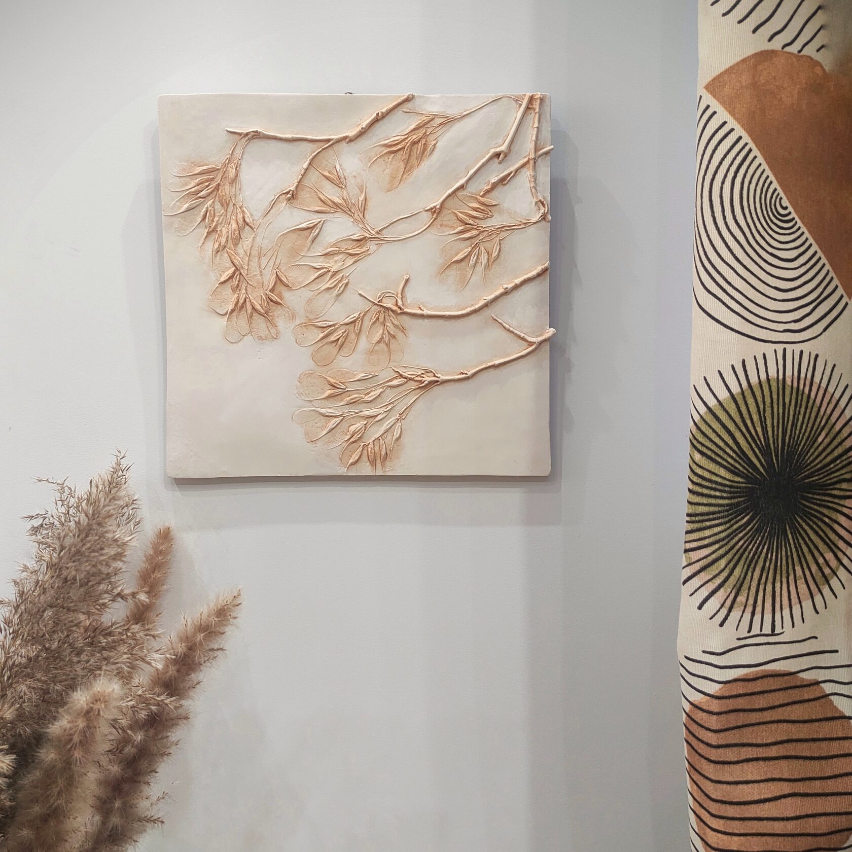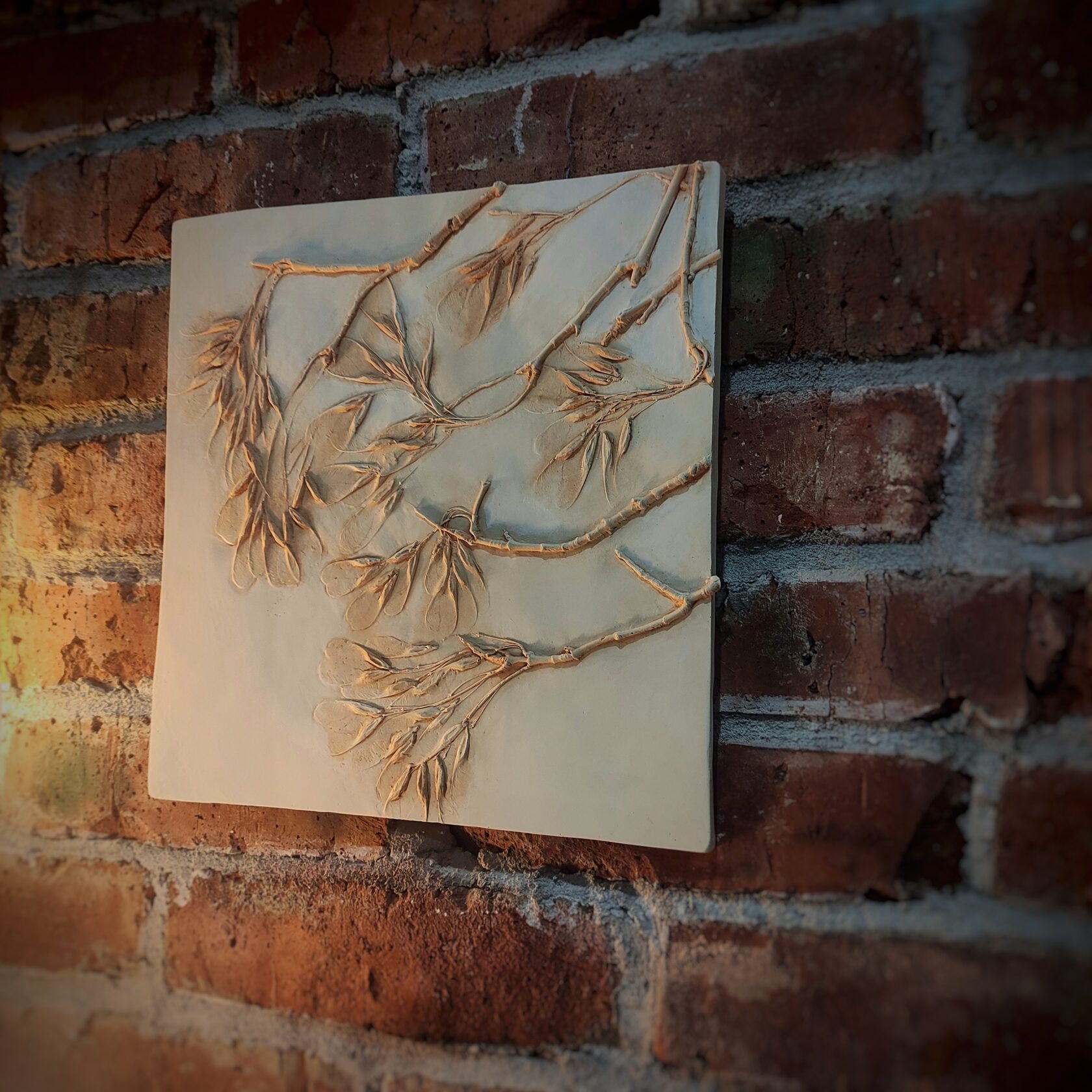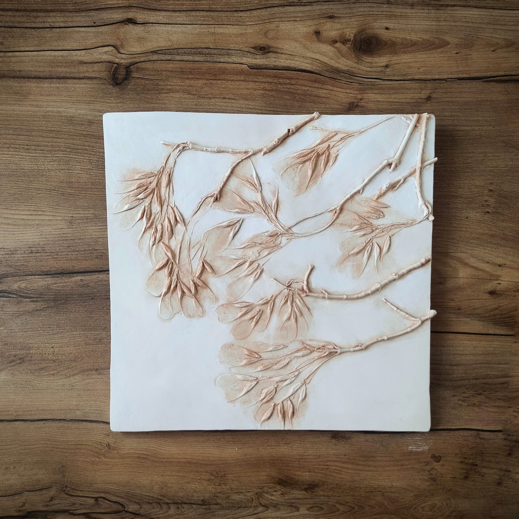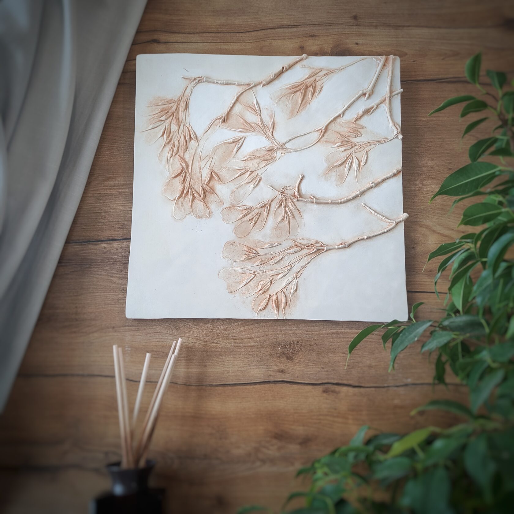 Панно разметром 30 см, толщиной 1 см без учета барельефного объема. Вес 1450 грамм. Ветви клена деликатно выглядывают за рамку барельефа и придают ему еще большей жизни. Лицевая сторона панно покрыта ангобами на основе красной глины и гидрофобным акриловым лаком. Тыльная сторона покрыта гидрофобным безцветным акриловым лаком. Панно можно подвесить на стену с помощью петель на тыльной стороне, либо поставить на подставку по вашему желанию. Панно можно тонировать и окрашивать красками: акрил, акварель, ангобы, лак. Перед работой с акрилом рекомендуем обработать панно грунтовкой. Барельеф допускается протирать влажной тканью.