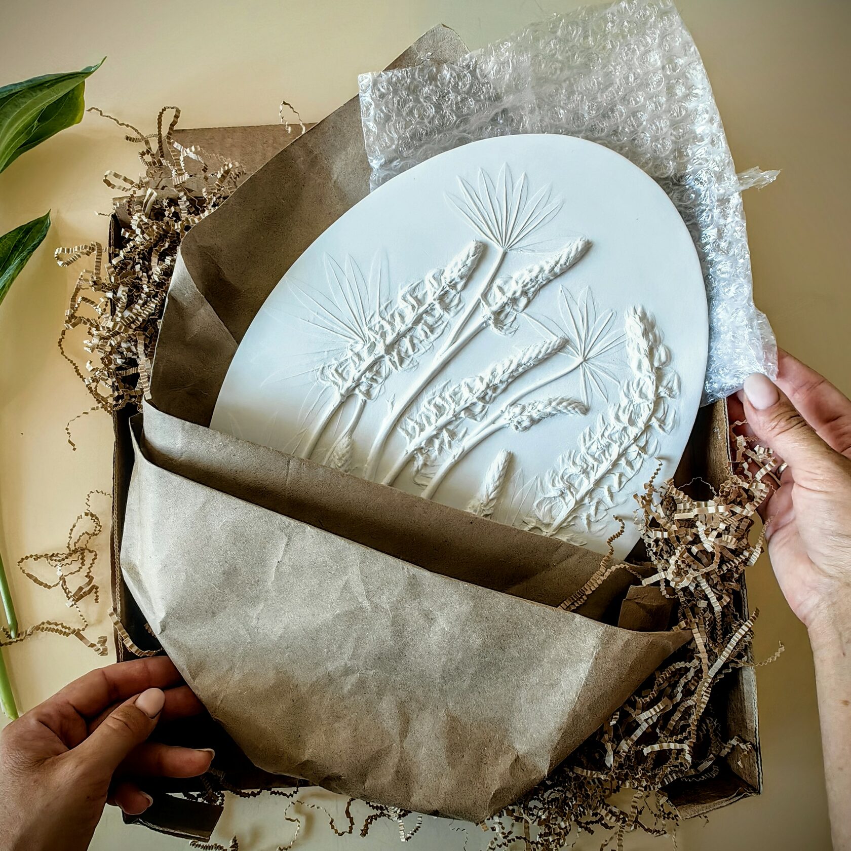 Мы уделяем упаковке и отгрузке особое внимание. Качественная надежная коробка, воздушно-пузырьковая пленка, маркировка. Немаловажно, что мы изготавливаем панно из самого лучшего на рынке скульптурного гипса, прочность которого так же позволяет нам не переживать даже за долгую дорогу.